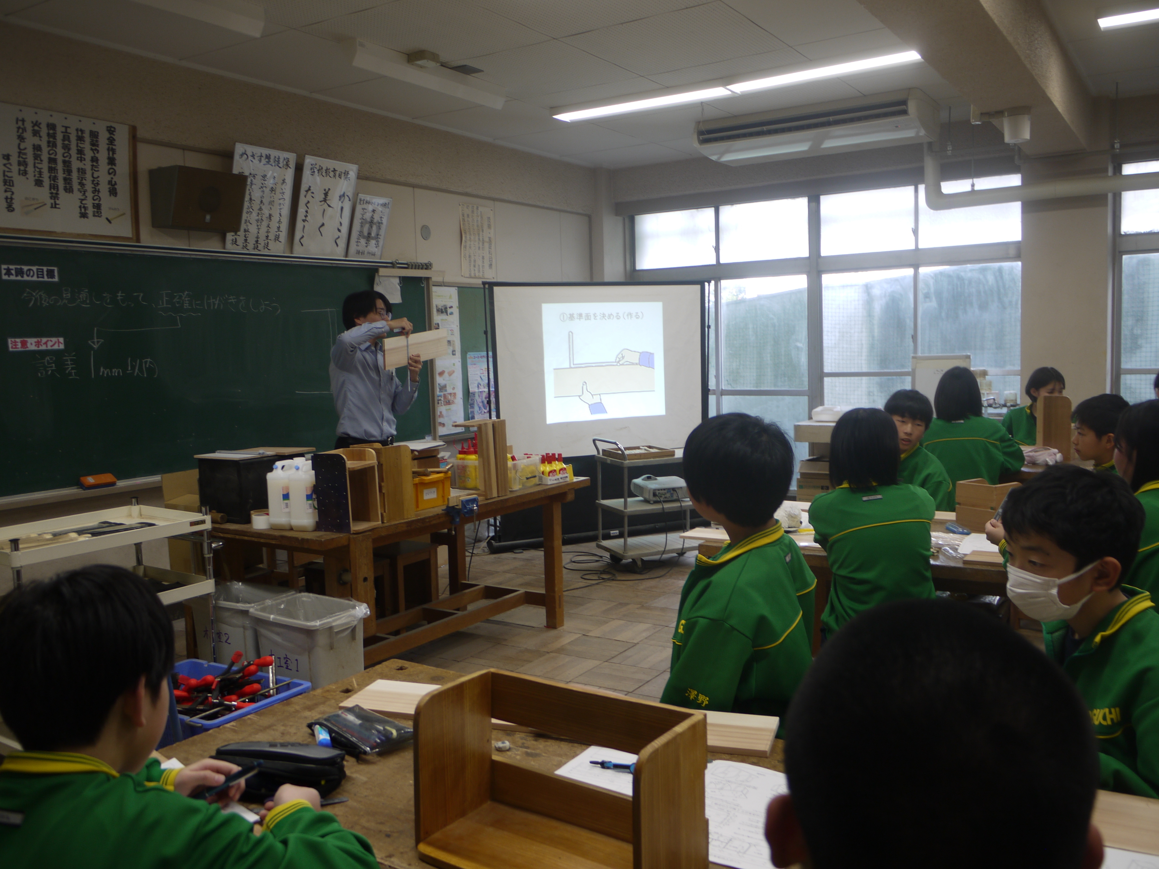1学年の技術の授業。のこぎりを使い作品作りです。