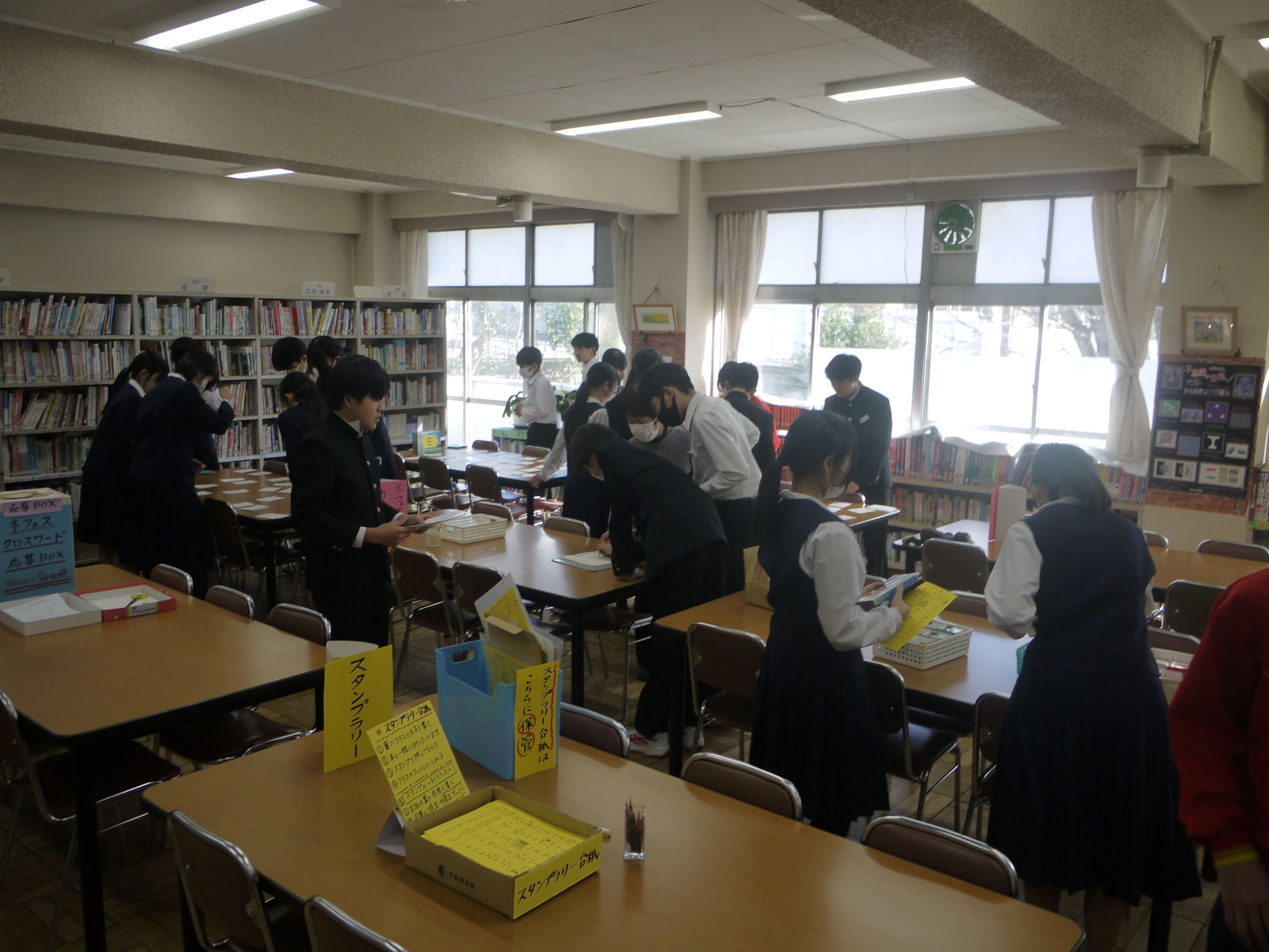 令和8年1月29日(木)から図書委員会が企画する「冬フェス」が行われています。内容は、本を借りるとスタンプがもらえる「スタンプラリー」「図書カルタ」本のタイトルを埋めていく「クロスワードパズル」などです。連日楽しそうな声が図書館から聞こえてきています。ぜひ、この機会にたくさんの本に触れて、新たに本の魅力を感じてもらえるといいですね。図書委員の皆さん、ありがとうございます。