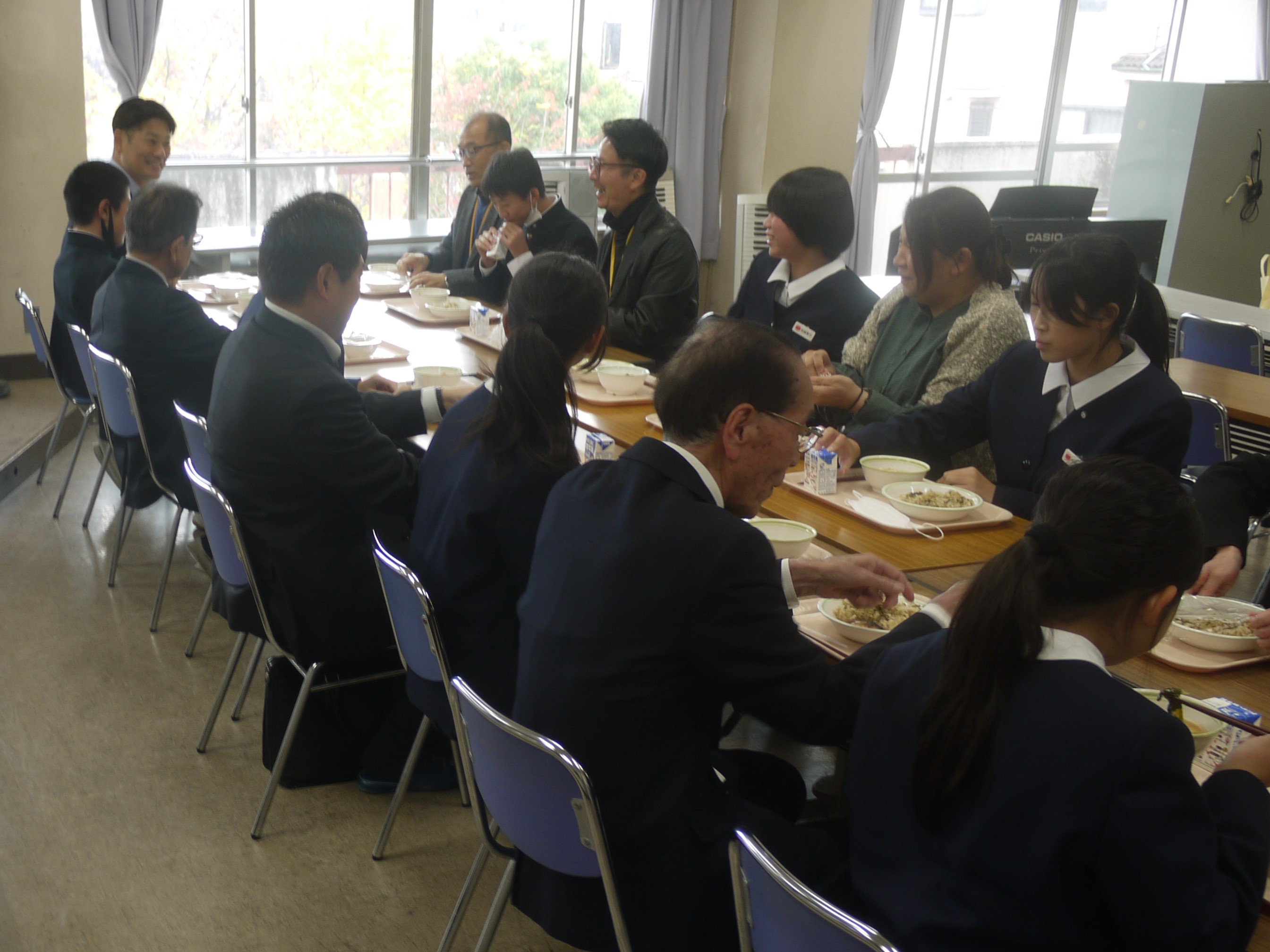 11月11日(火)に第2回学校運営協議会が行われました。今回の会議には、生徒会の役員8名にも参加してもらい、来年度に向けての話し合いを行い、活発な意見交換がなされていました。またその後の会食にも生徒会役員に参加してもらい楽しく話をしながら給食をいただきました。運営委員の皆様からも、生徒と話ができる機会がもててうれしかったです、とのお言葉をもらいました。今後も、地域と学校が子どもを中心とした繋がりで教育活動を進めてまいります。