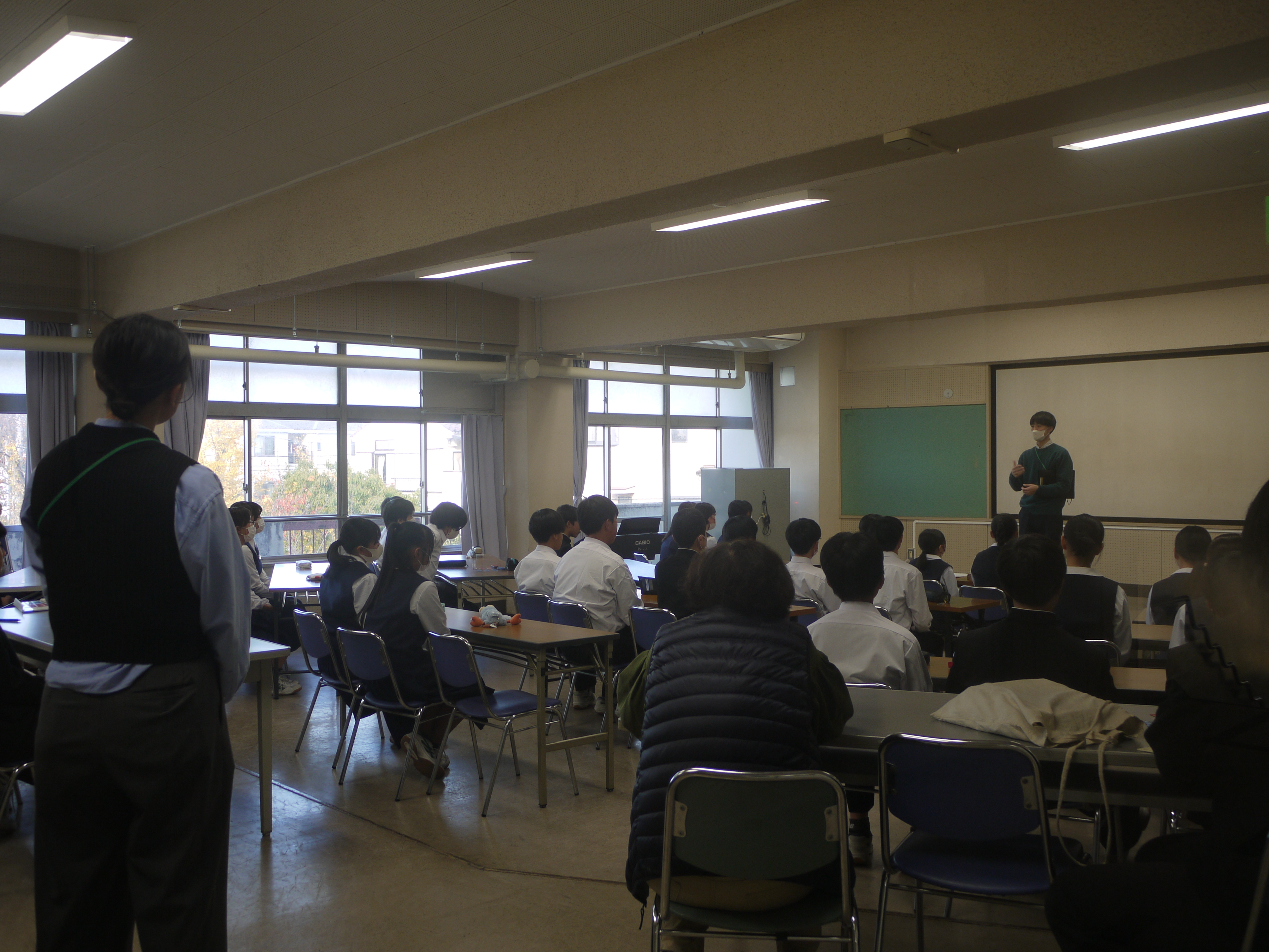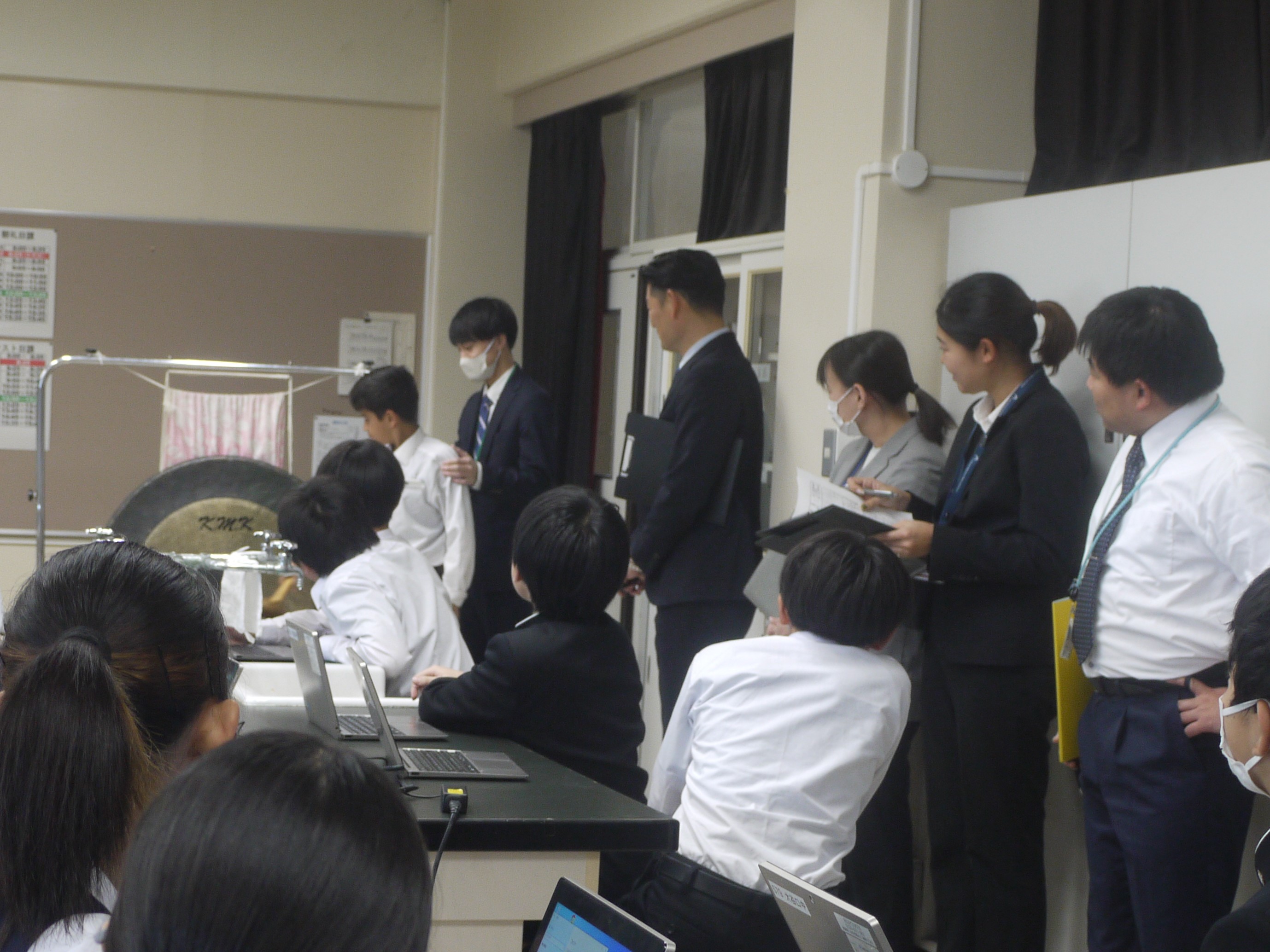 令和7年11月20日(木)にさいたま市の教職員が一斉に各学校に行き、研修を行う「市教育研究会研修大会」があり、本校が会場校となり、1年1組の理科の授業が行われました。授業の課題は「音の伝わり方」について考察する内容で、5つの実験道具から各自で選び、実験して結論を出す授業でした。多くの先生方が参観する中、生徒たちは積極的に活動し、いい表情で取り組んでいました。